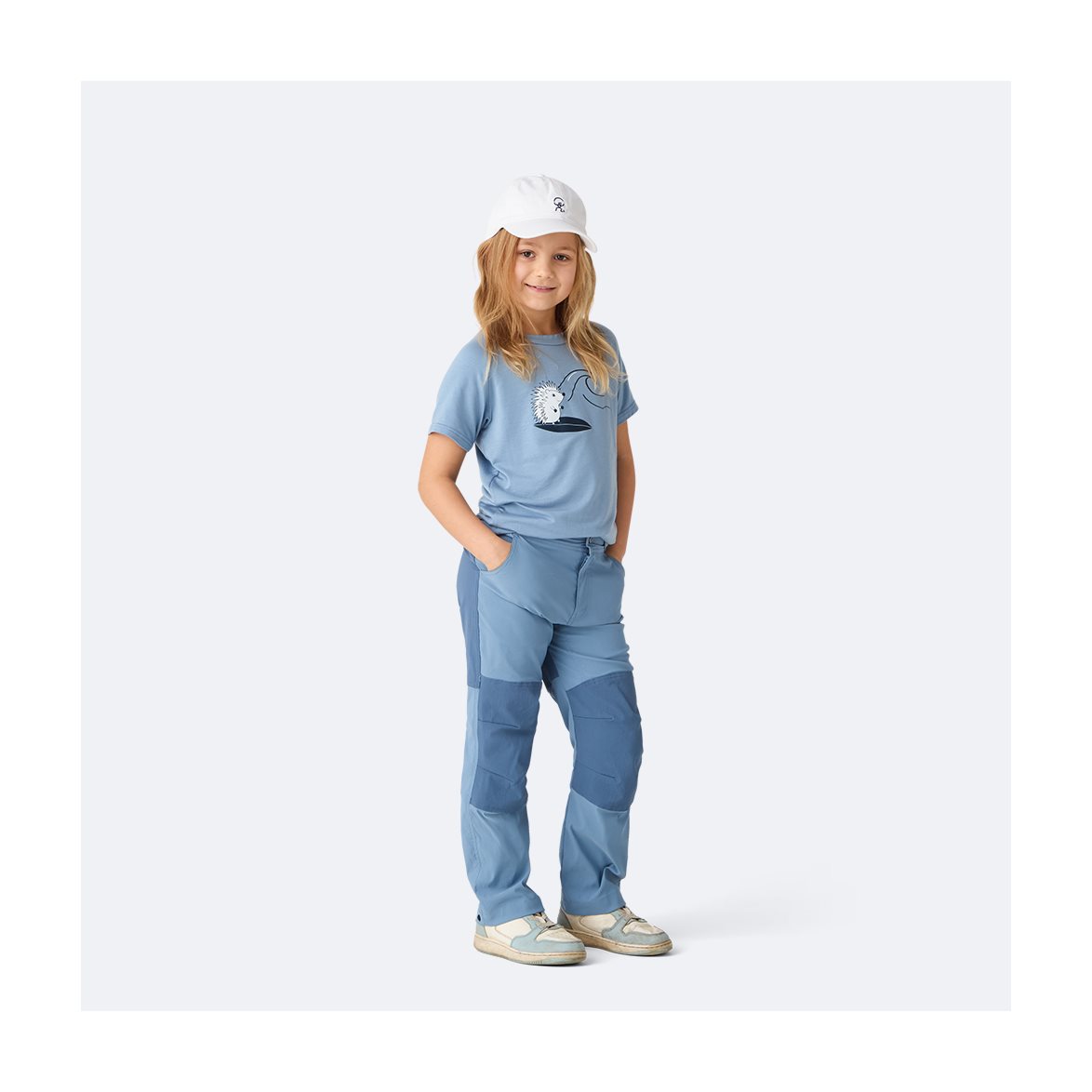 Byxan har en stilren design och är förstärkt på utsatta områden som knän och bakdel – perfekt för barn som gärna klättrar, kryper, springer och upptäcker. Passformen är anpassad för aktivitet med förböjda knän och en högre linning baktill som sitter bra även i rörelse.